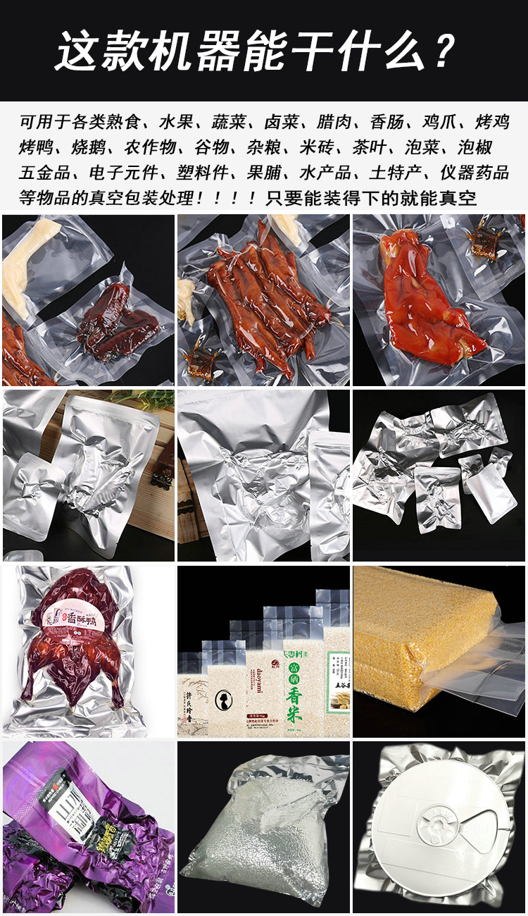 选用电脑板操控,要求包装物水平放置进行抽真空的机器,配有主动和脚踏开关,工作台板能够上下调整,以合适不同厚度的物体的真空包装,机器运用起来更快捷、简略易操作。外抽式真空包装机适用于电子科技类产品,如晶片、半导体、IC、金属加工件的防潮、防氧化变色等,布料、棉羊毛制品等,进行真空包装、下降包装体积,坚持原味、新鲜、并可防冲击。